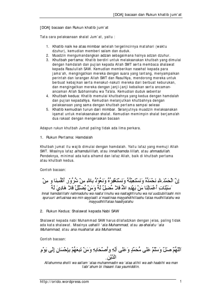 118 bahwa belum ditemukan dalil baik Al-Quran maupun Al-Hadits yang memerintahkan agar pada saat khatib duduk antara dua khutbah para jamaah membaca shalawat atau bacaan tersebut. Bacaan khatib shalat jumat. Setelah selesai membaca shalawat ini selanjutnya khatib berdiri dan menyampaikan khutbahnya yang kedua.