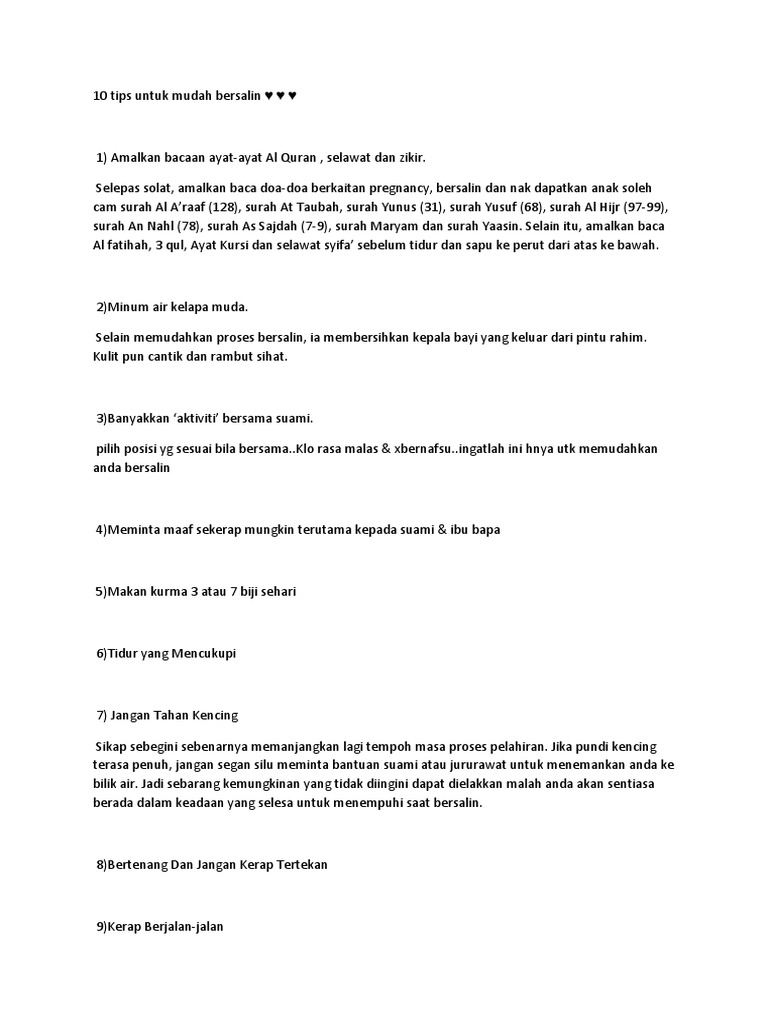 Apa agaknya tips mudah bersalin yang diamalkan oleh mereka Sekali dengar memang sukar dipercayai bahawa ada segelintir wanita yang berjaya melahirkan bayi secara normal tanpa memerlukan jahitan. Makna setiap doa juga turut dinyatakan. Untuk memudahkan ibu bersalin dan memperolehi anak yang sabar dan taat.