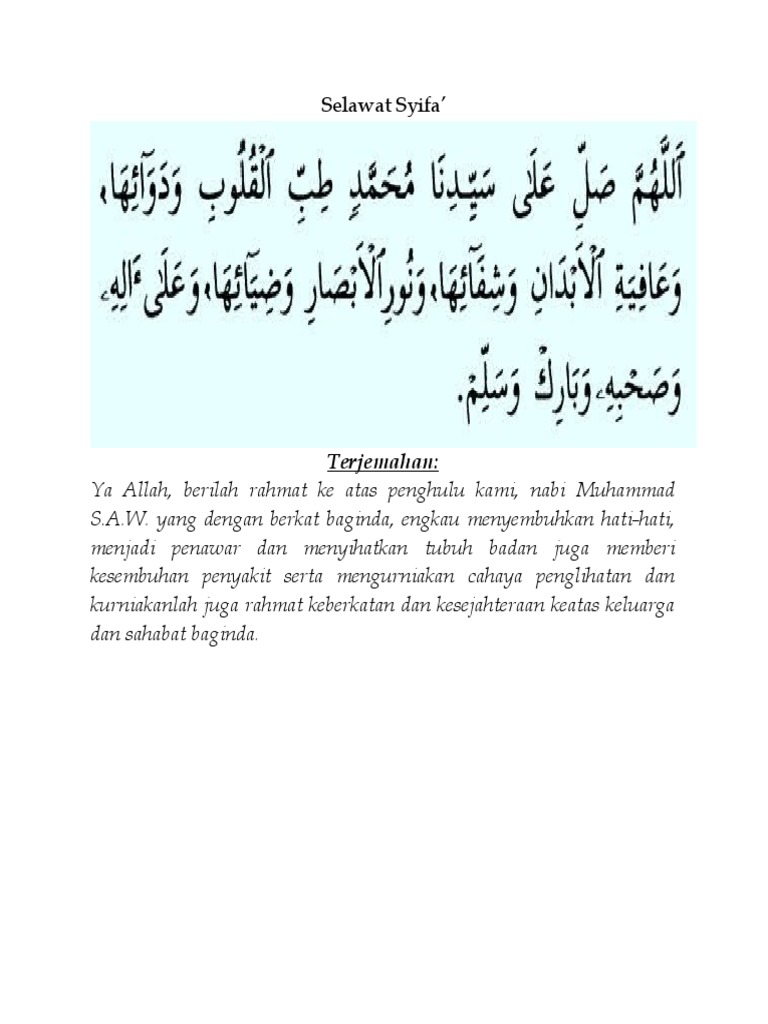 Video - Rawatan Sakit Sendi Kaedah Rawatan 1 Ambil daun pokok lidah buaya Alovera ambil lendir dan 2 Baca surah Al Fatihah dan Ayatul Kursi 3 Baca surah A. Listen Selawat Syifa mp3 songs free online by Munif Ahmad. Munif Ahmad reciting Selawat Dawam on Astro OasisWith Malay and English translation.