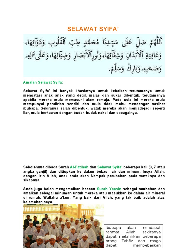 Amalan inipun dapat di. Bacaan selawat syifa adalah seperti berikut. Shalawat Thibbil Qulub atau sholawat Syifa adalah shalawat yang sering digunakan untuk wasilah penyembuhan suatu penyakit.
